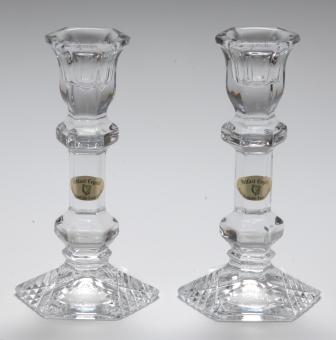 Large candle sticks in box. Belfast Crystal with traditional crystal cut. Available with PSNI or RUC engraved crest, aprrox 6" in height.