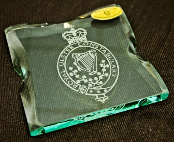 Belfast crystal square coaster in presentation box. Available with PSNI or RUC crest, approx 4" in width.
