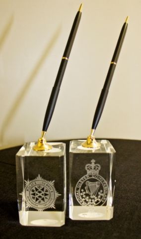 Belfast crystal pen holder in presentation box. Available with PSNI or RUC crest.
