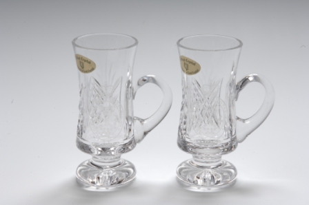 Pair of irish coffee glasses in presentation box. Belfast crystal with traditional crystal cut. Available with PSNI or RUC crest engraved, approx 5" in height.
